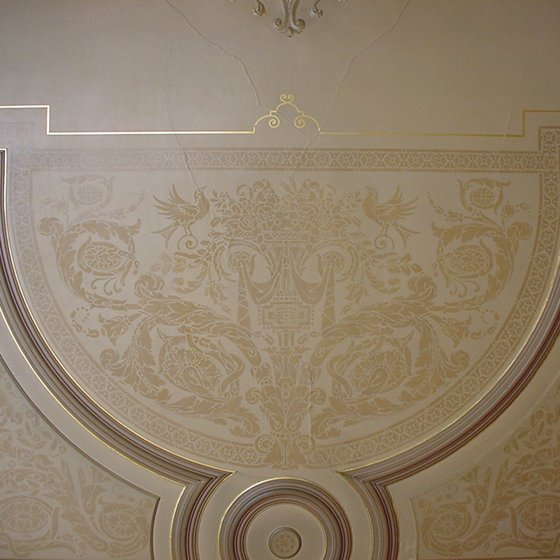 Door waterschade was een deel van dit prachtige plafond onherstelbaar beschadigd. Dit is gedeeltelijk vernieuwd, geschilderd op linnen, en de rest is ter plaatse gerestaureerd.